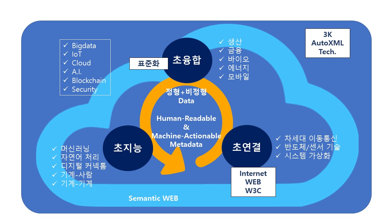 나아가, 3KOneAI가 활용하는 글로벌 원천기술 AutoXML은 기계가 읽고 행동하게 만드는 AI 최적의 기계학습형 메타데이터로서 강인공지능을 구현하는데 최적화된 데이터라 자부할 수 있습니다.